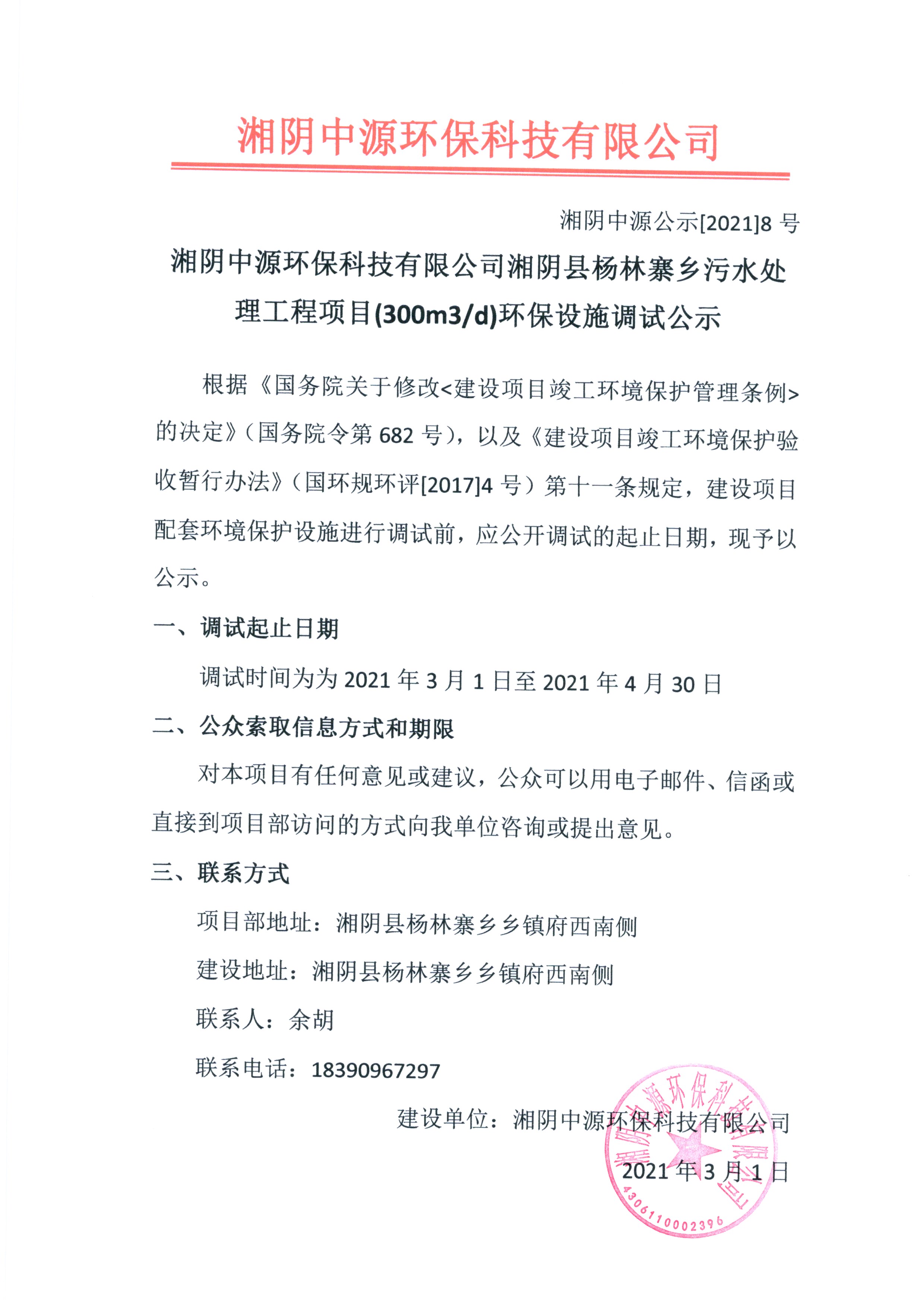 根據(jù)《國務(wù)院關(guān)于修改建設(shè)項(xiàng)目竣工環(huán)境保護(hù)管理?xiàng)l例的決定》(國務(wù)院令第682號(hào)) ,以及環(huán)保部《關(guān)于發(fā)布-建設(shè)項(xiàng)目竣工環(huán)境保護(hù)驗(yàn)收暫行辦法的公告》(國環(huán)規(guī)環(huán)評(píng) [2017] 4號(hào)),現(xiàn)將湘陰中源環(huán)??萍加邢薰鞠骊幙h楊林寨鄉(xiāng)污水處理工程項(xiàng)目(300m3/d) 調(diào)試時(shí)間公示如下: