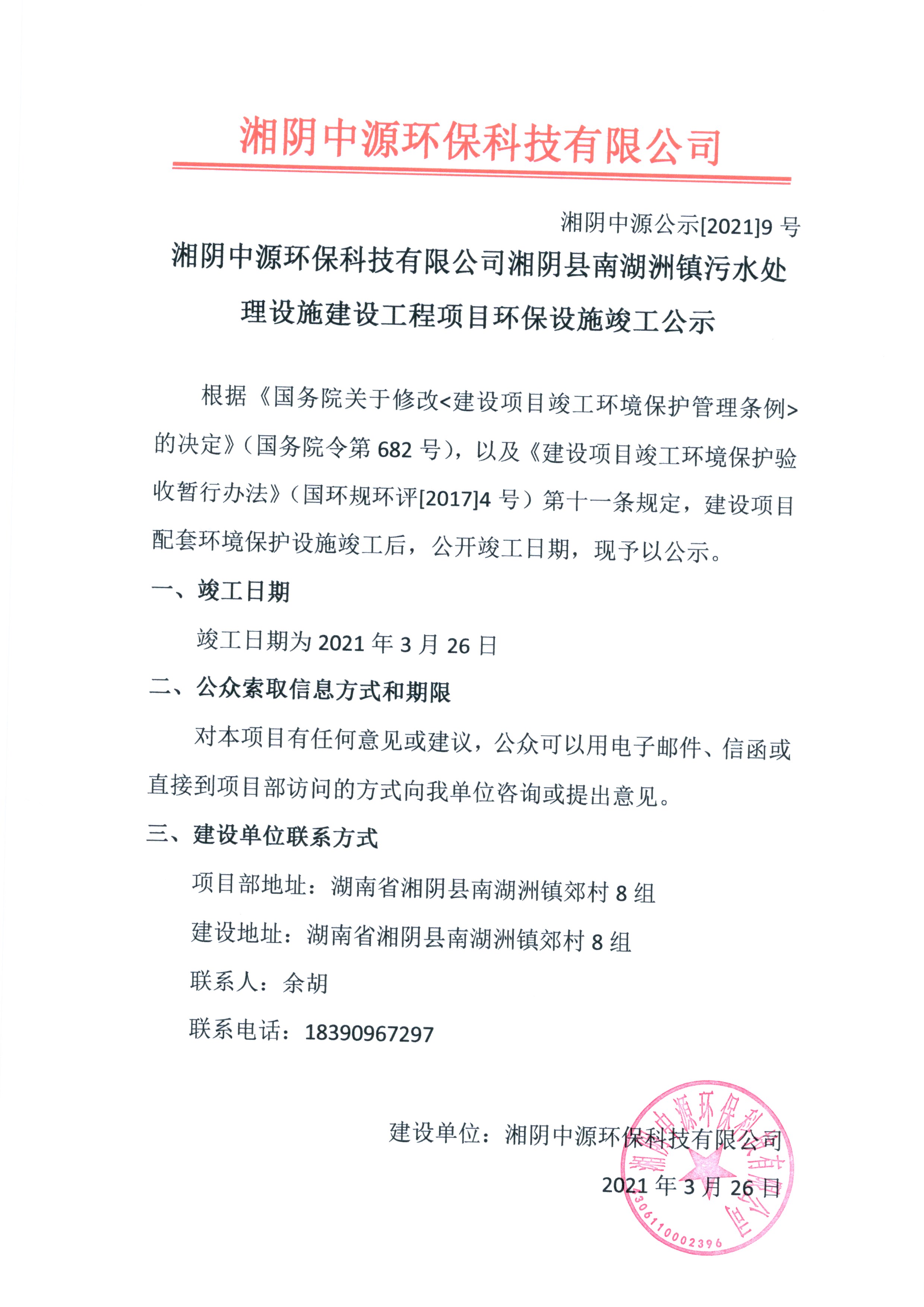 根據《國務院關于修改建設項目竣工環(huán)境保護管理條例的決定》(國務院令第682號) ,以及環(huán)保部《關于發(fā)布-建設項目竣工環(huán)境保護驗收暫行辦法的公告》(國環(huán)規(guī)環(huán)評 [2017] 4號),現將湘陰中源環(huán)保科技有限公司湘陰縣南湖洲鎮(zhèn)污水處理設施建設項目工程調試時間公示如下: